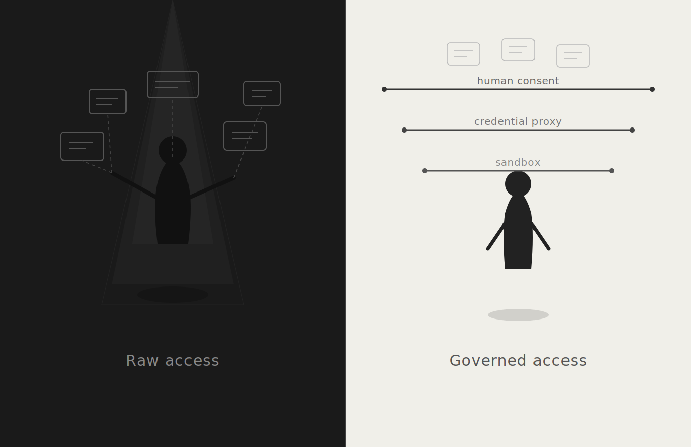A sandbox gives you filesystem isolation and network restrictions. It keeps the agent from rm -rf-ing your root directory or reaching arbitrary hosts on the internet. This is table stakes — necessary but not sufficient. It’s the equivalent of not letting a new employee wander around your office unsupervised with a master key. Fine. But that employee still needs to do their job, which means they need access to some things.